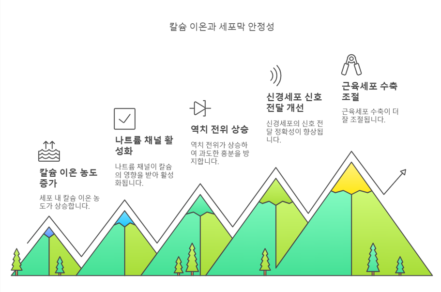 2.세포막 안정화 : 칼슘 이온은 세포막의 나트륨 채널을 안정화시키고, 고칼륨혈증으로 인해 감소된 나트륨 채널의 활성화를 복구하여 심근세포의 전기적 안정을 회복시킨다.